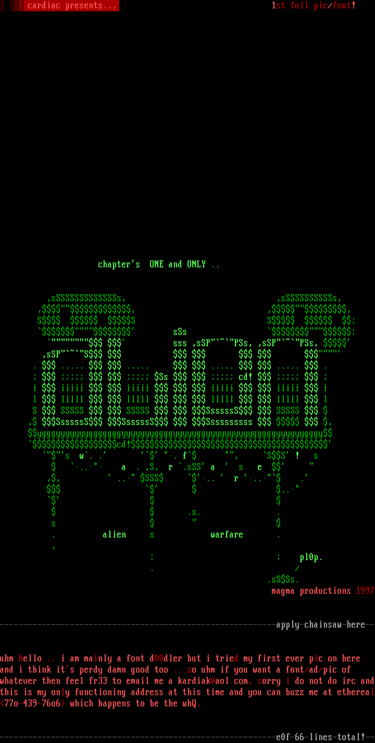 and i think its perdy damn good too .. so uhm if you want a font/ad/pic of whatever then feel fr33 to email me a kardiak@aol.com, sorry i do not do irc andthis is my only functioning address at this time and you can buzz me at ethereal77o-439-76o6 which happens to be the whQ.