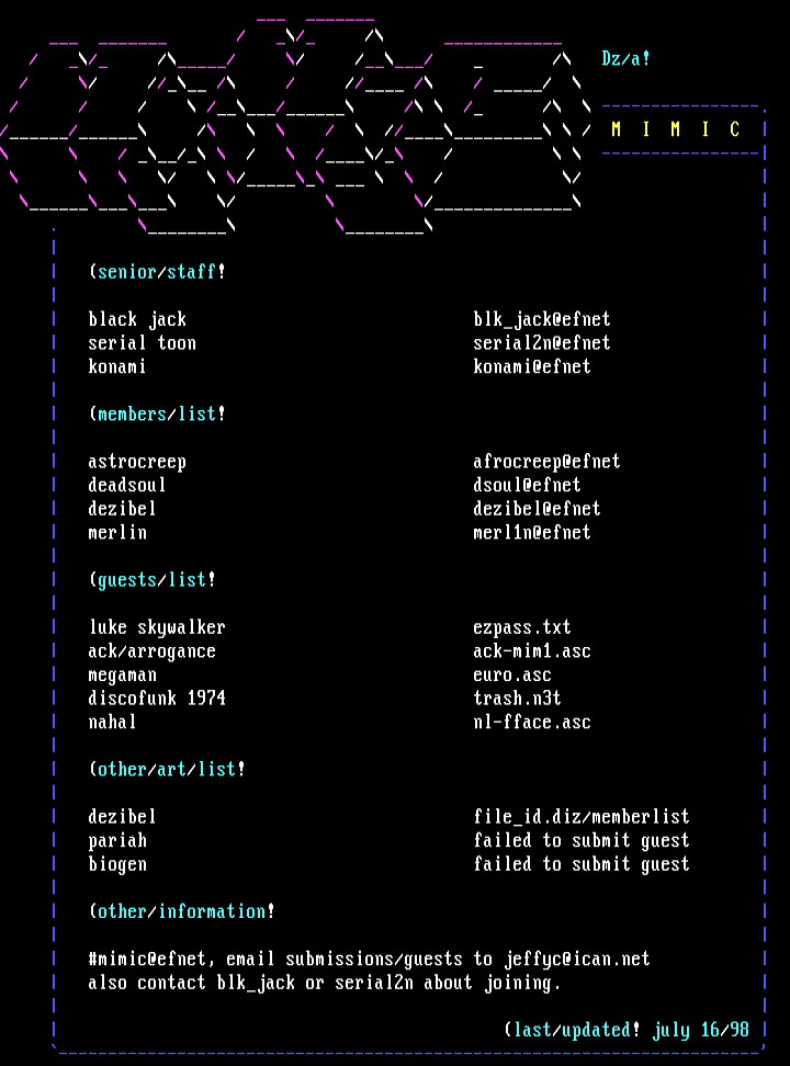 mimic@efnet, email submissions/guests to jeffyc@ican.net