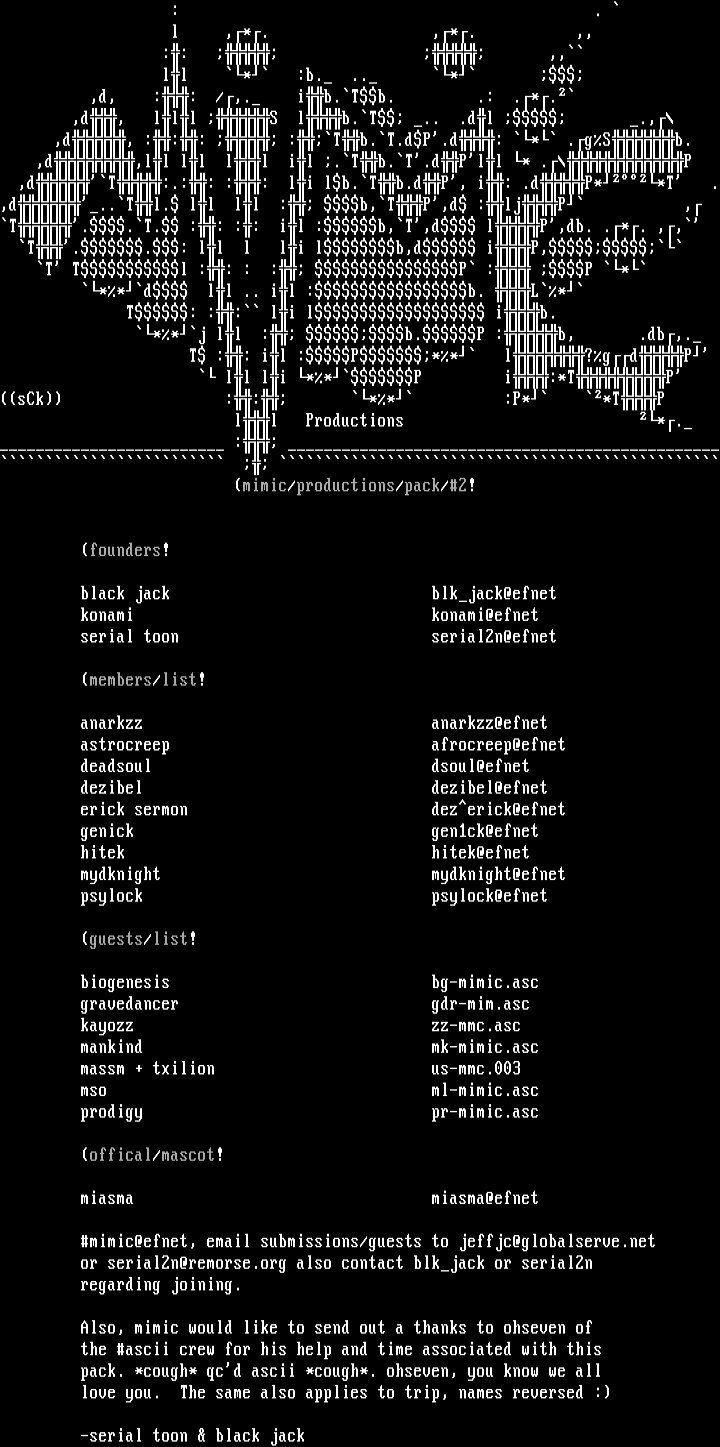 mimic@efnet, email submissions/guests to jeffjc@globalserve.net