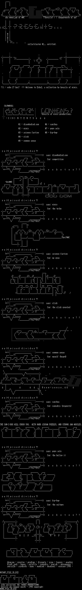 astrocreep (1) black jack (1) cain (3) craig kayozz (4) dead soul (2) deviant (3) dezibel (2) el nino (1) genick (1) keetar (3) kresile (3) luke skywalker (1) meatpod (2) mimic ascii (3) mydknight (7) psylock (2) revolution (1) serial toon (3) toons xilion (1) tribal (1) tzeentch (2)
