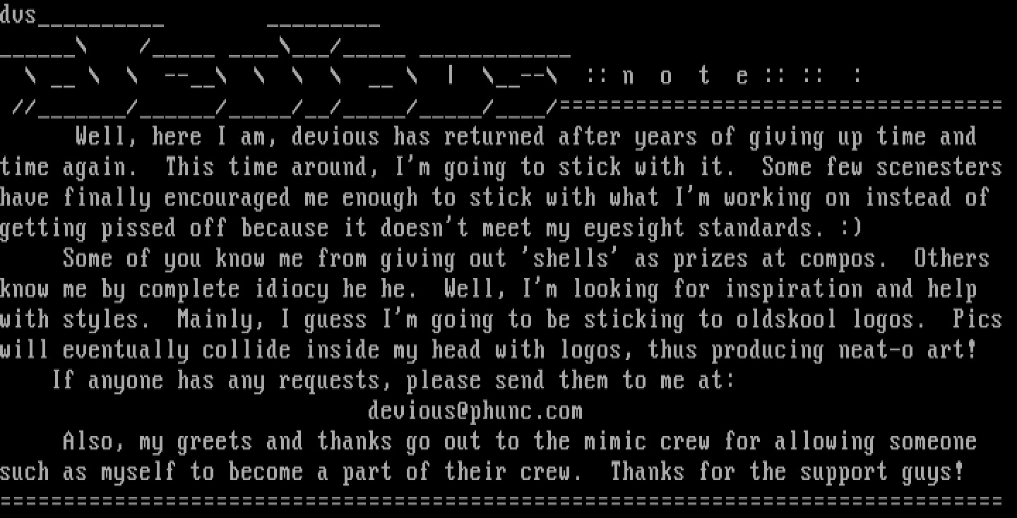 Also, my greets and thanks go out to the mimic crew for allowing someone