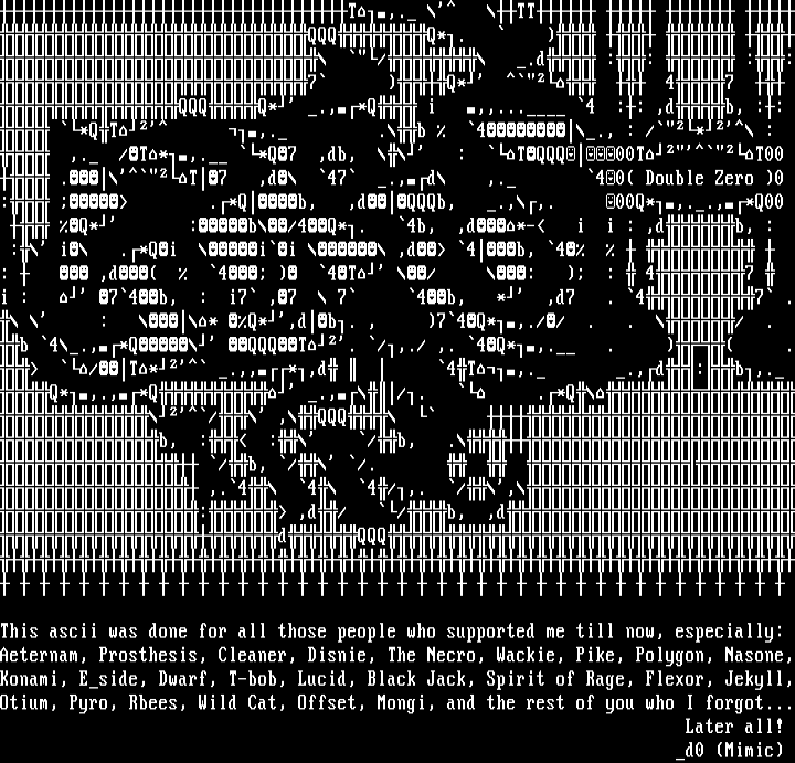 Aeternam, Prosthesis, Cleaner, Disnie, The Necro, Wackie, Pike, Polygon, Nasone,Konami, Eside, Dwarf, T-bob, Lucid, Black Jack, Spirit of Rage, Flexor, Jekyll,Otium, Pyro, Rbees, Wild Cat, Offset, Mongi, and the rest of you who I forgot... Later all!