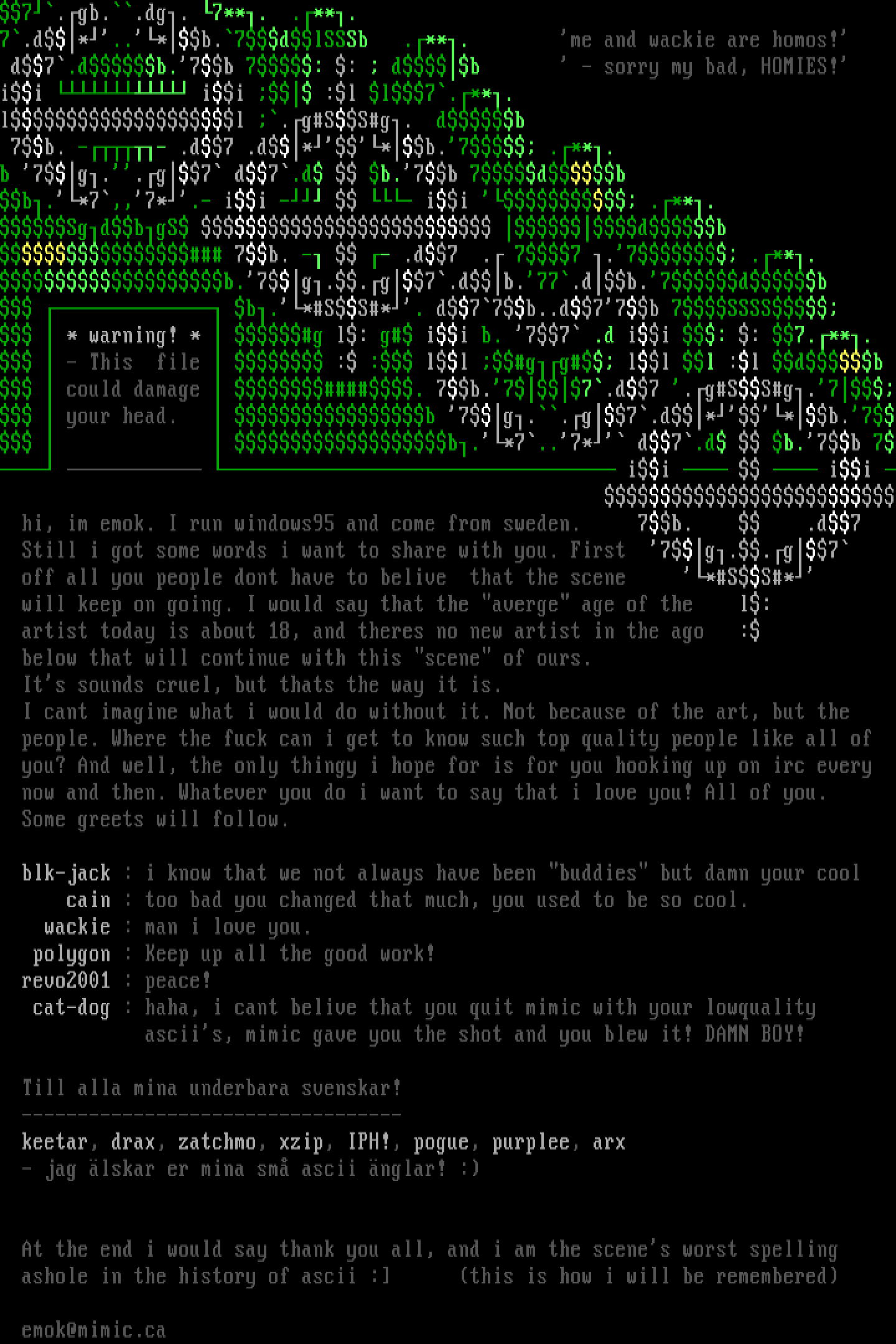 could damage . 7b.77.d7 .gSSg.7 your head. b 7g..g7.d**b.7 b.*7..7* d7.d b.7b 7 ii ii hi, im emok. I run windows95 and come from sweden. 7b. .d7 Still i got some words i want to share with you. First 7g..g7 off all you people dont have to belive that the scene *SS* will keep on going. I would say that the averge age of the l: artist today is about 18, and theres no new artist in the ago : below that will continue with this scene of ours.