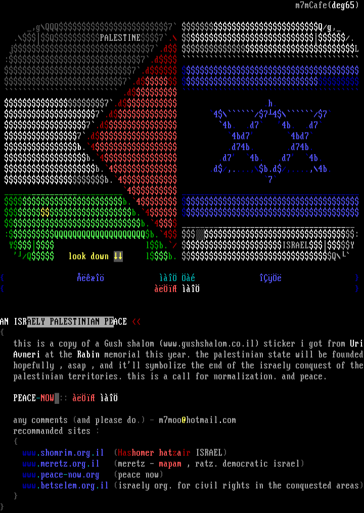 this is a copy of a Gush shalom www.gushshalom.co.il sticker i got from Uri Avneri at the Rabin memorial this year. the palestinian state will be founded hopefully , asap , and itll symbolize the end of the israely conquest of the palestinian territories. this is a call for normalization. and peace.
