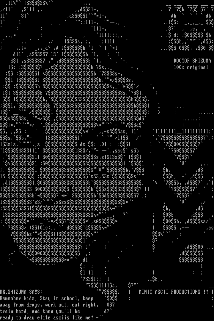 7lllls, 7 DR.SHIZUMA SAYS: 7 l MIMIC ASCII PRODUCTIONS !! lRemember kids, Stay in school, keep 0 :away from drugs, work out, eat right, 07 .train hard, and then youll be d7