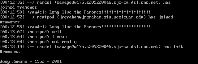 00:12:55 randel Long live the Ramones!!!!!!!!!!!!!!!!!!!!