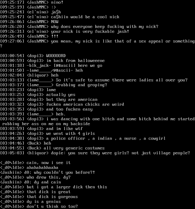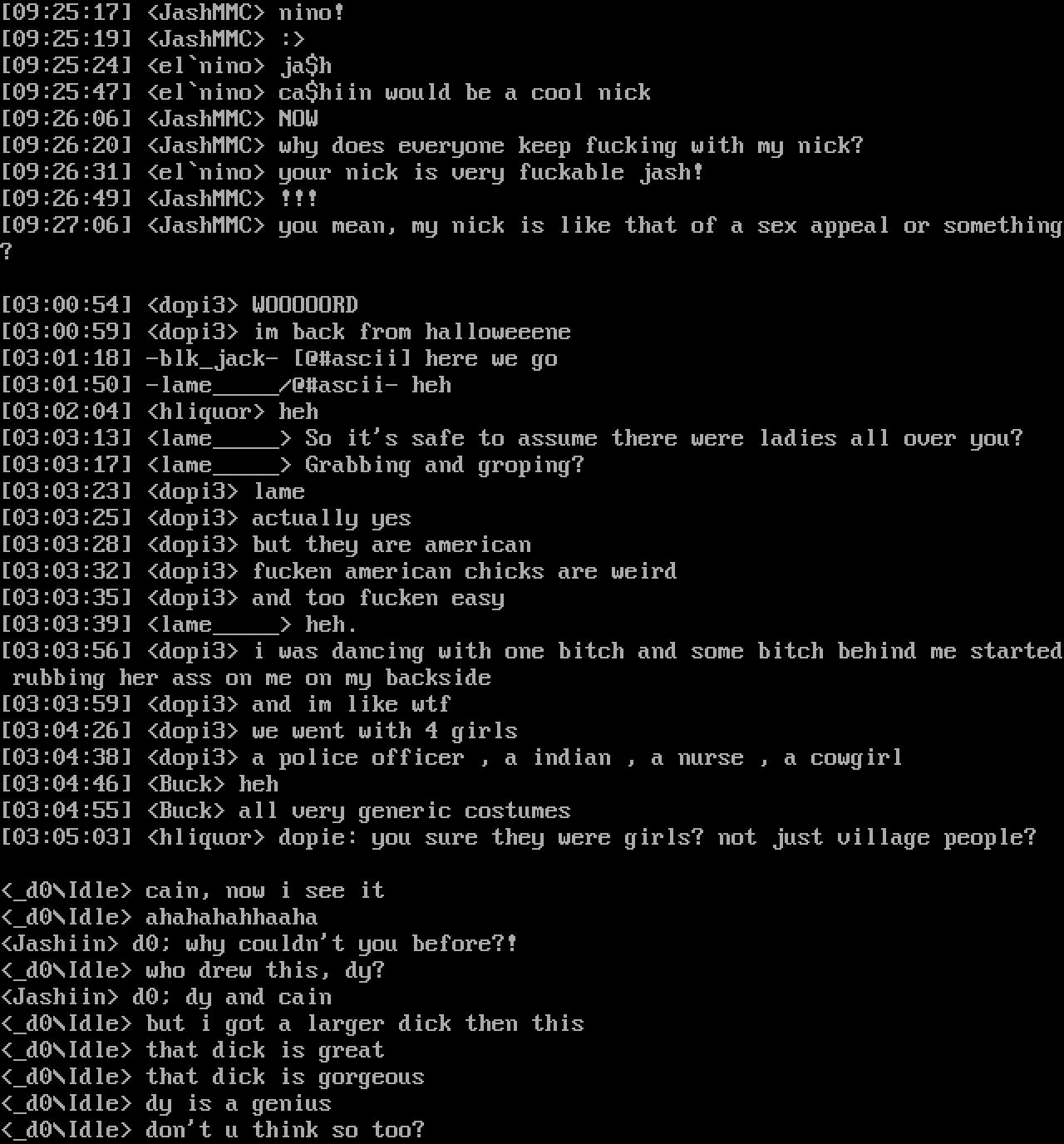 03:03:56 dopi3 i was dancing with one bitch and some bitch behind me started rubbing her ass on me on my backside