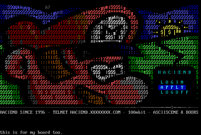 HACIEND SINCE 1996 - TELNET HACIEND.XXXXXXXX.COM - 100mbit - ASCIISCENE DOORS