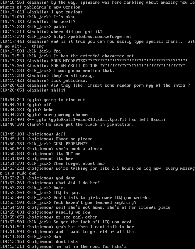 13:53:40 blkjack Dont talk to girls over ICQ you weirdo.