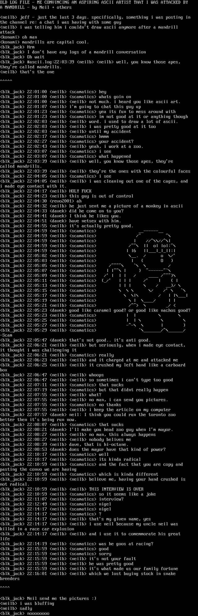 OLD LOG FILE - ME CONVINCING AN ASPIRING ASCII ARTIST THAT I WAS ATTACKED BY