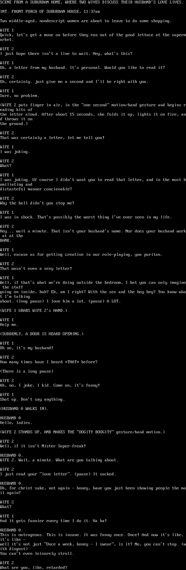 WIFE 2. Wait, a minute. What are you talking about.