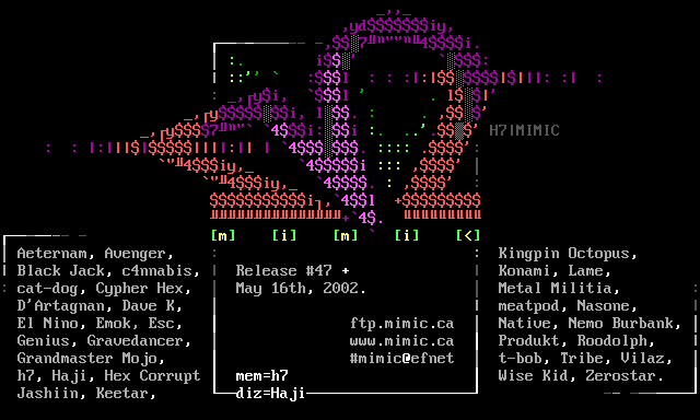 Black Jack, c4nnabis, Release 47 + Konami, Lame, : cat-dog, Cypher Hex, May 16th, 2002. Metal Militia, : DArtagnan, Dave K, meatpod, Nasone, El Nino, Emok, Esc, ftp.mimic.ca Native, Nemo Burbank, Genius, Gravedancer, www.mimic.ca Produkt, Roodolph, Grandmaster Mojo, mimic@efnet t-bob, Tribe, Vilaz, h7, Haji, Hex Corrupt memh7 Wise Kid, Zerostar. Jashiin, Keetar, dizHaji --