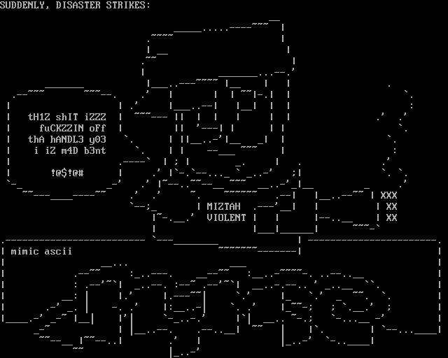 SUDDENLY, DISASTER STRIKES: .....---- . . ...--. ..--- . .-- --. . -. . . ..-- : tH1Z shIT iZZZ --- . . fuCKZZIN oFf --- . thA hANDL3 y03 . ..- . i iZ m4D b3nt . -- : .---- . . . !@!@ . -.--... ..- . . - - . --..-- ..- . ------- . . . .-- ..-- XXX -- MIZTAH .--- XX -.. VIOLENT --.. XX - .------------------------- --- -----------------------. mimic ascii ------- ... .-- :..---. -- :..--. ..--.. : .-- ..--. :-- .-- ..-.--.. .. . : . .--- . . . . .- . -. . :..- . . - .. .- - -..-. .. -. -... - - ..--. .--.. . --... -- --.. . ..- -.. ..-