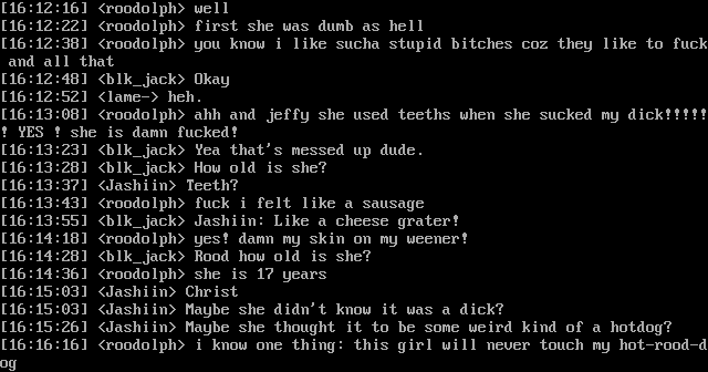 16:13:08 roodolph ahh and jeffy she used teeths when she sucked my dick!!!!!! YES ! she is damn fucked!