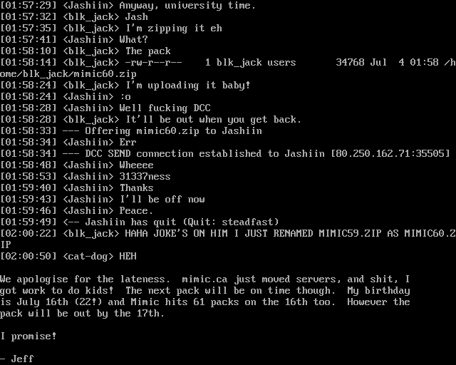 02:00:22 blkjack HAHA JOKES ON HIM I JUST RENAMED MIMIC59.ZIP AS MIMIC60.ZIP
