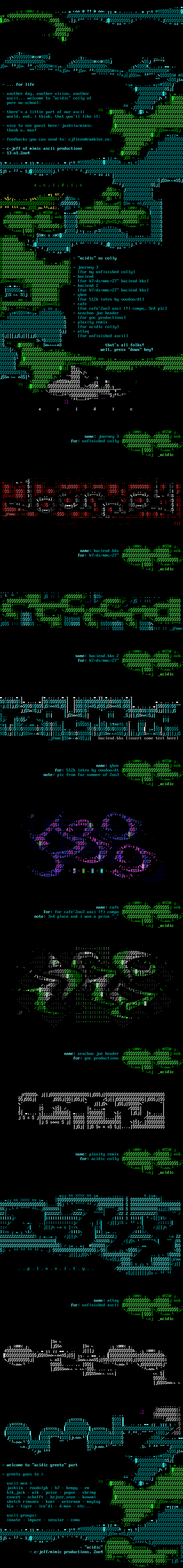 - another day, another vision, another /l ,, ascii... welcome to acidic colly of jj pure nu-school . 7. s .. .. .jj 1 - theres a little part of our ascii .j . jS world, and, i think, that youll like it jk, s@ - nice to see guest here: jashiin/mimic. thank u, man! jjSSj