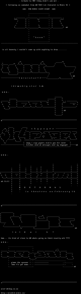 ansichrist (1) barium (3) bbqface (1) c-jeff (2) cat-dog (4) discyple (3) h7 (2) jashiin (4) keetar (1) konami (1) lam ron (1) lame (5) maytag (3) mimic ascii (4) mr violent (1) noches (1) pdz (1) pogue (1) spinsane (1) vilaz (1) wise kid (1)