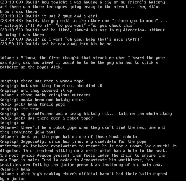 23:49:00 David: hey tonight i was having a cig on my friends balcony