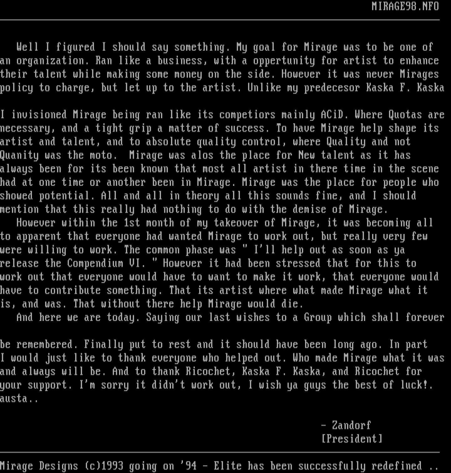Mirage Designs c1993 going on 94 - Elite has been successfully redefined ..