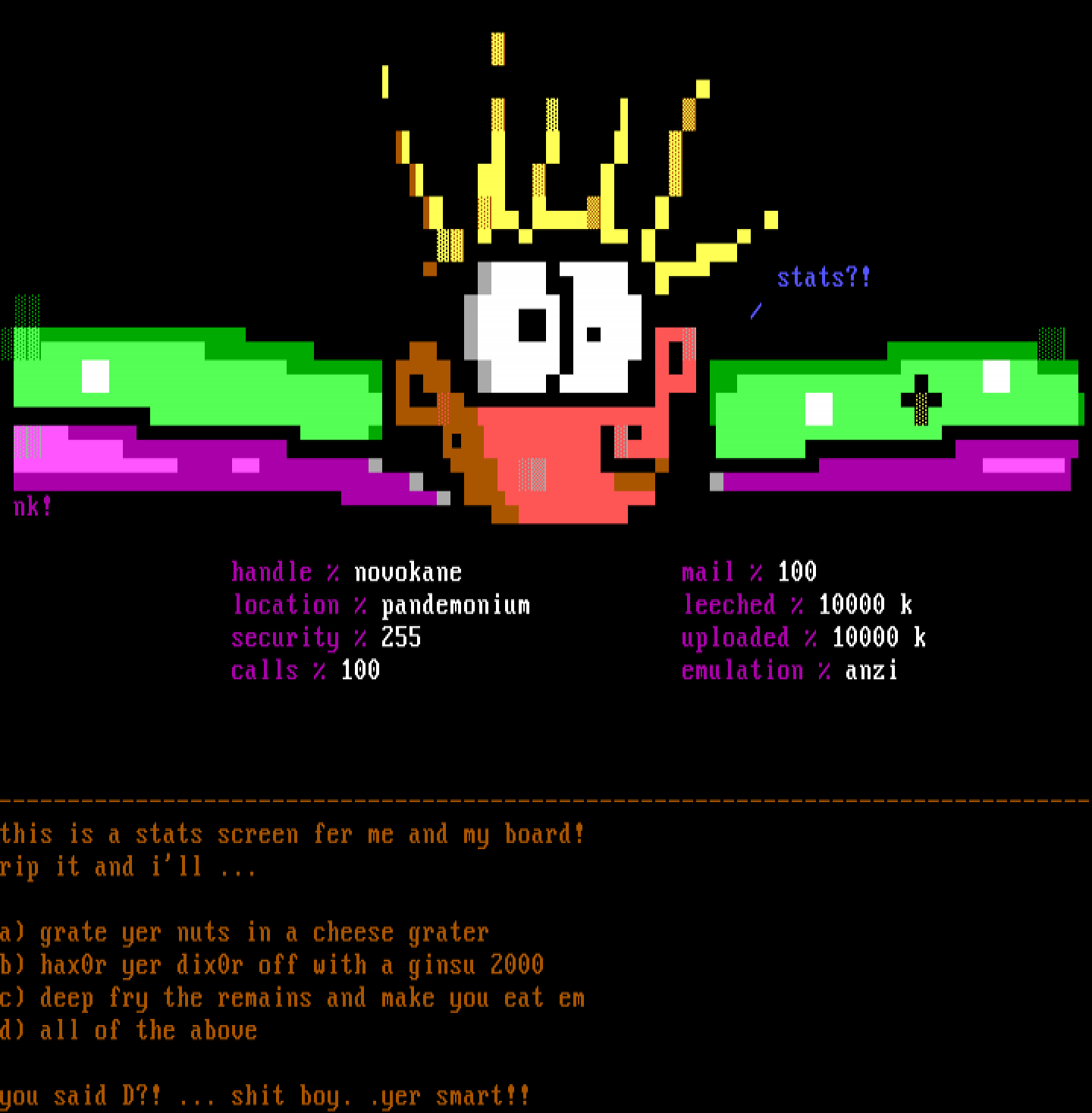 --------------------------------------------------------------------------------this is a stats screen fer me and my board!