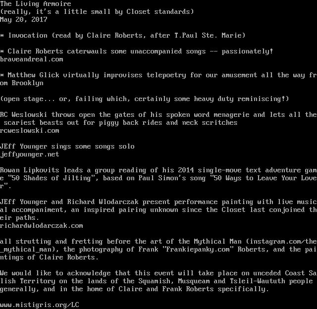 JEff Younger and Richard Wlodarczak present performance painting with live musical accompaniment, an inspired pairing unknown since the Closet last conjoined their paths.