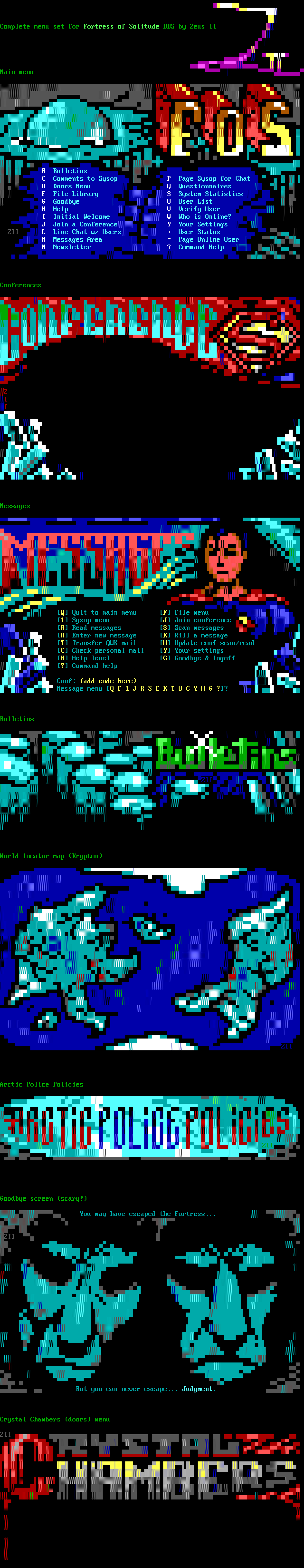 Complete menu set for Fortress of Solitude BBS by Zeus II