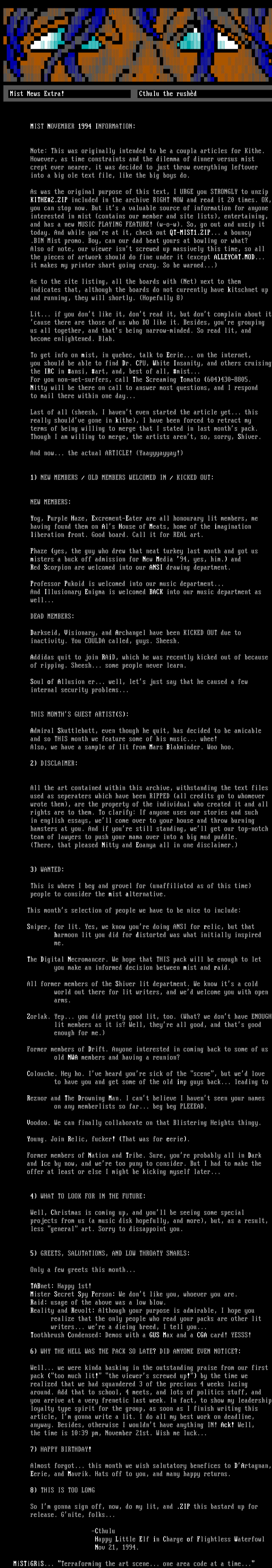 you should be able to find Dr. CPU, White Insanity, and others cruising the IRC in ansi, art, and, best of all, mist...