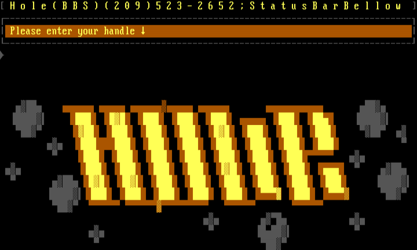 H o l e B B S 2 0 9 5 2 3 - 2 6 5 2 S t a t u s B a r B e l l o w ------------------------------------------------------------------------------ Please enter your handle ------------------------------------------------------------------------------