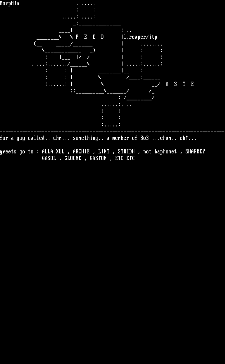 greets go to : ALLA XUL , ARCHIE , LINT , STRIDH , not baphomet , SHARKEY