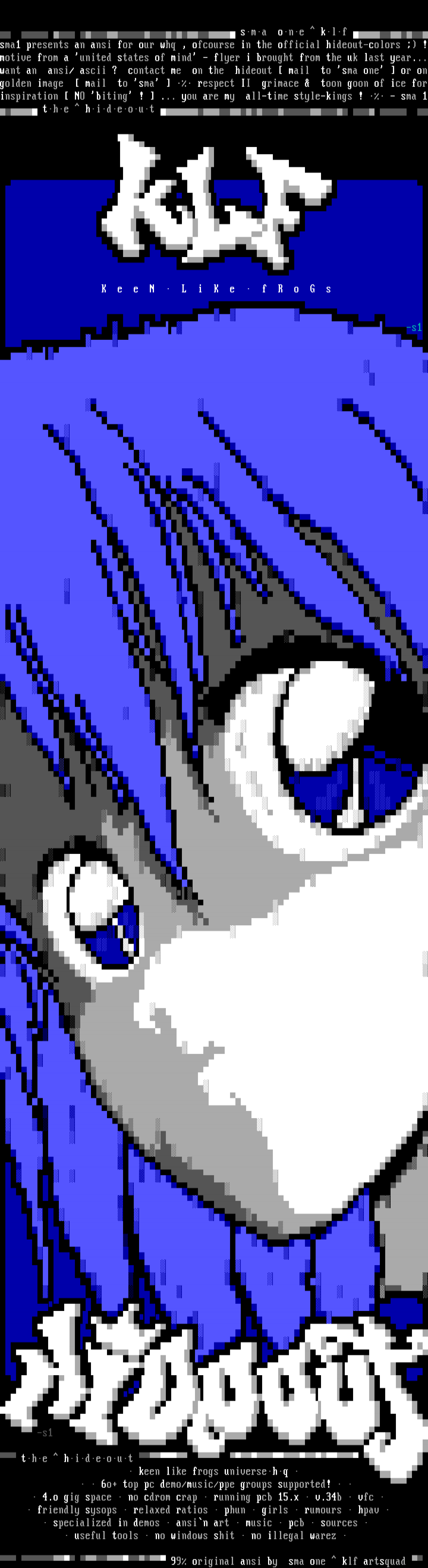 sma one klf sma1 presents an ansi for our whq , ofcourse in the official hideout-colors !motive from a united states of mind - flyer i brought from the uk last year...want an ansi/ ascii ? contact me on the hideout mail to sma one or ongolden image mail to sma respect II grimace toon goon of ice forinspiration NO biting ! ... you are my all-time style-kings ! - sma 1 the hideout