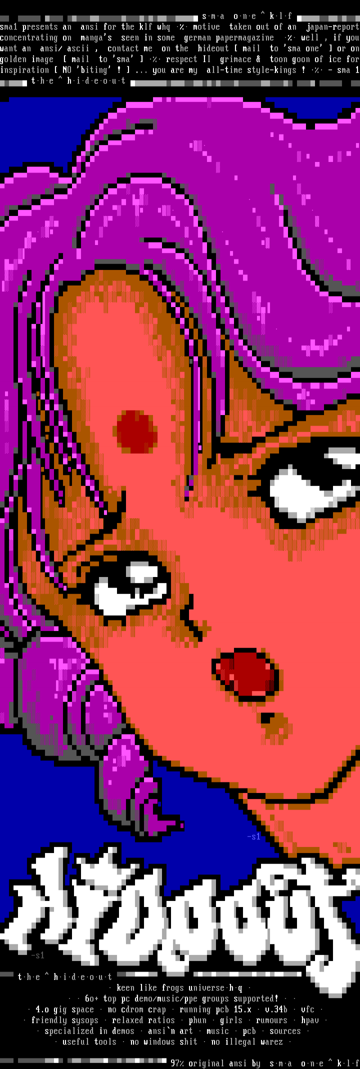 sma one klf sma1 presents an ansi for the klf whq motive taken out of an japan-reportconcentrating on mangas seen in some german papermagazine well , if youwant an ansi/ ascii , contact me on the hideout mail to sma one or ongolden image mail to sma respect II grimace toon goon of ice forinspiration NO biting ! ... you are my all-time style-kings ! - sma 1 the hideout