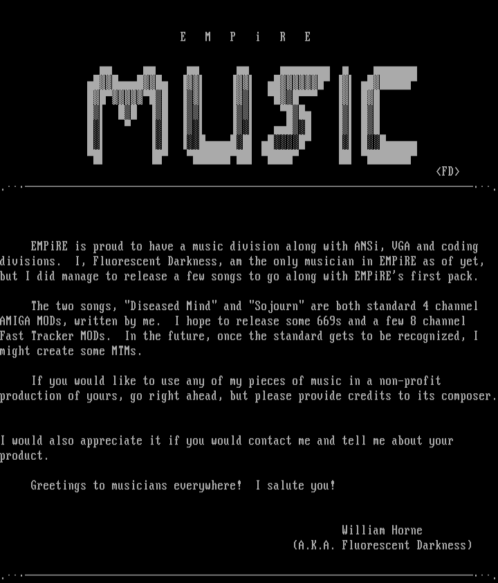 EMPiRE is proud to have a music division along with ANSi, VGA and coding