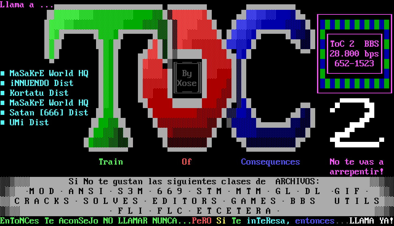 ToC 2 BBS 28.800 bps 652-1523 MaSaKrE World HQ By iNNUENDO Dist Xose Kortatu Dist MaSaKrE World HQ