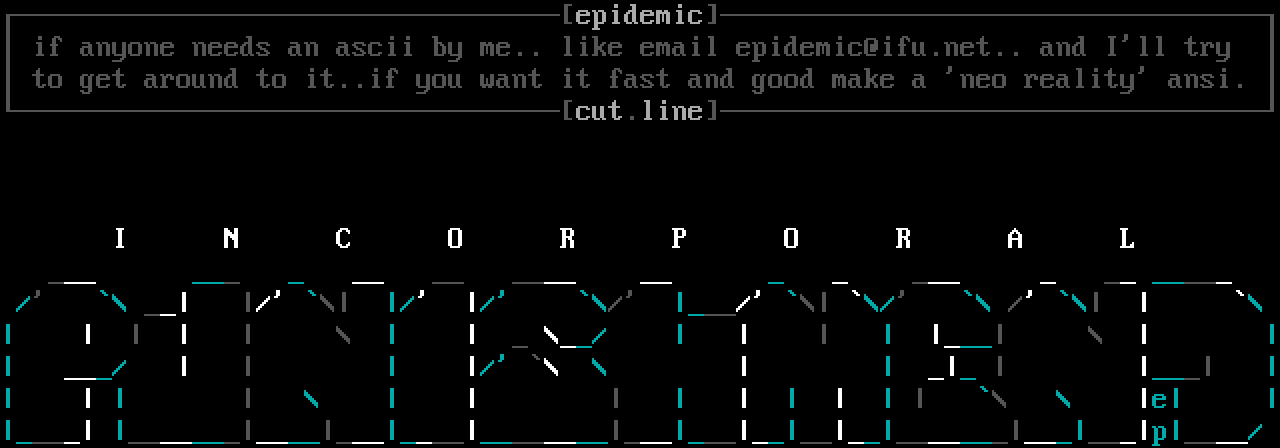 epidemic if anyone needs an ascii by me.. like email epidemic@ifu.net.. and Ill try to get around to it..if you want it fast and good make a neo reality ansi. cut.line