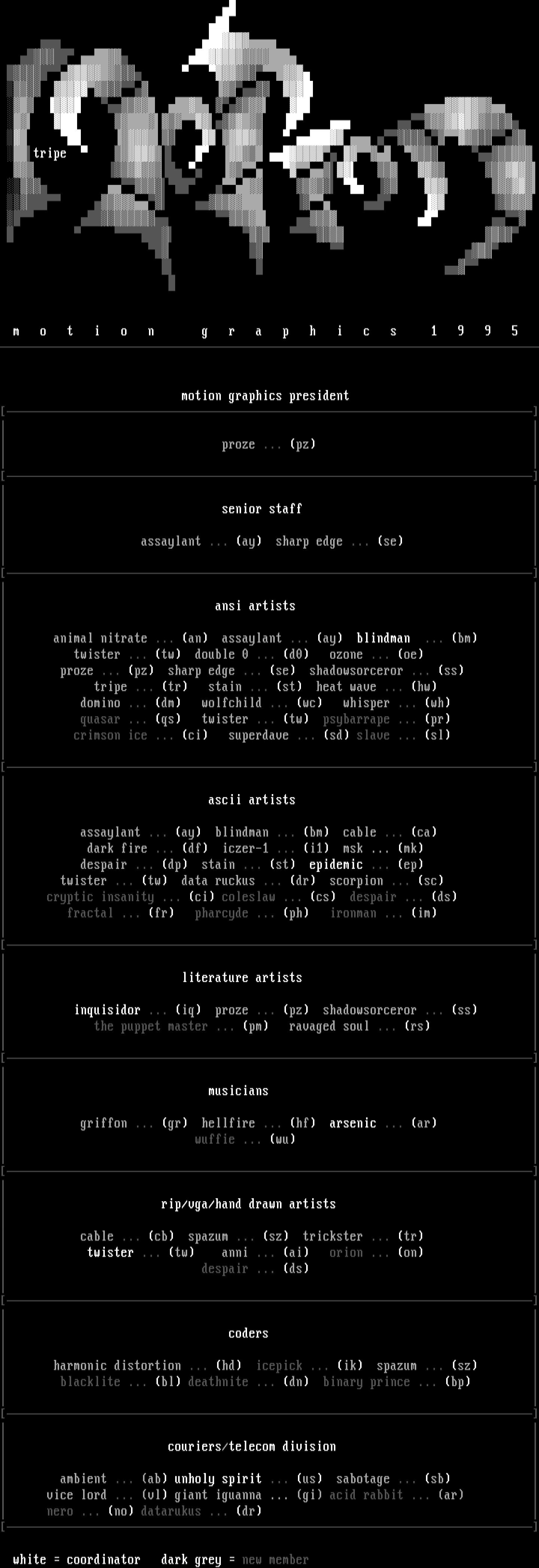 proze ... pz senior staff assaylant ... ay sharp edge ... se ansi artists animal nitrate ... an assaylant ... ay blindman ... bm twister ... tw double 0 ... d0 ozone ... oe proze ... pz sharp edge ... se shadowsorceror ... ss tripe ... tr stain ... st heat wave ... hw domino ... dm wolfchild ... wc whisper ... wh quasar ... qs twister ... tw psybarrape ... pr crimson ice ... ci superdave ... sd slave ... sl ascii artists assaylant ... ay blindman ... bm cable ... ca dark fire ... df iczer-1 ... i1 msk ... mk despair ... dp stain ... st epidemic ... ep twister ... tw data ruckus ... dr scorpion ... sc cryptic insanity ... ci coleslaw ... cs despair ... ds fractal ... fr pharcyde ... ph ironman ... im literature artists inquisidor ... iq proze ... pz shadowsorceror ... ss the puppet master ... pm ravaged soul ... rs musicians griffon ... gr hellfire ... hf arsenic ... ar wuffie ... wu rip/vga/hand drawn artists cable ... cb spazum ... sz trickster ... tr twister ... tw anni ... ai orion ... on despair ... ds coders harmonic distortion ... hd icepick ... ik spazum ... sz blacklite ... bl deathnite ... dn binary prince ... bp couriers/telecom division ambient ... ab unholy spirit ... us sabotage ... sb vice lord ... vl giant iguanna ... gi acid rabbit ... ar nero ... no datarukus ... dr