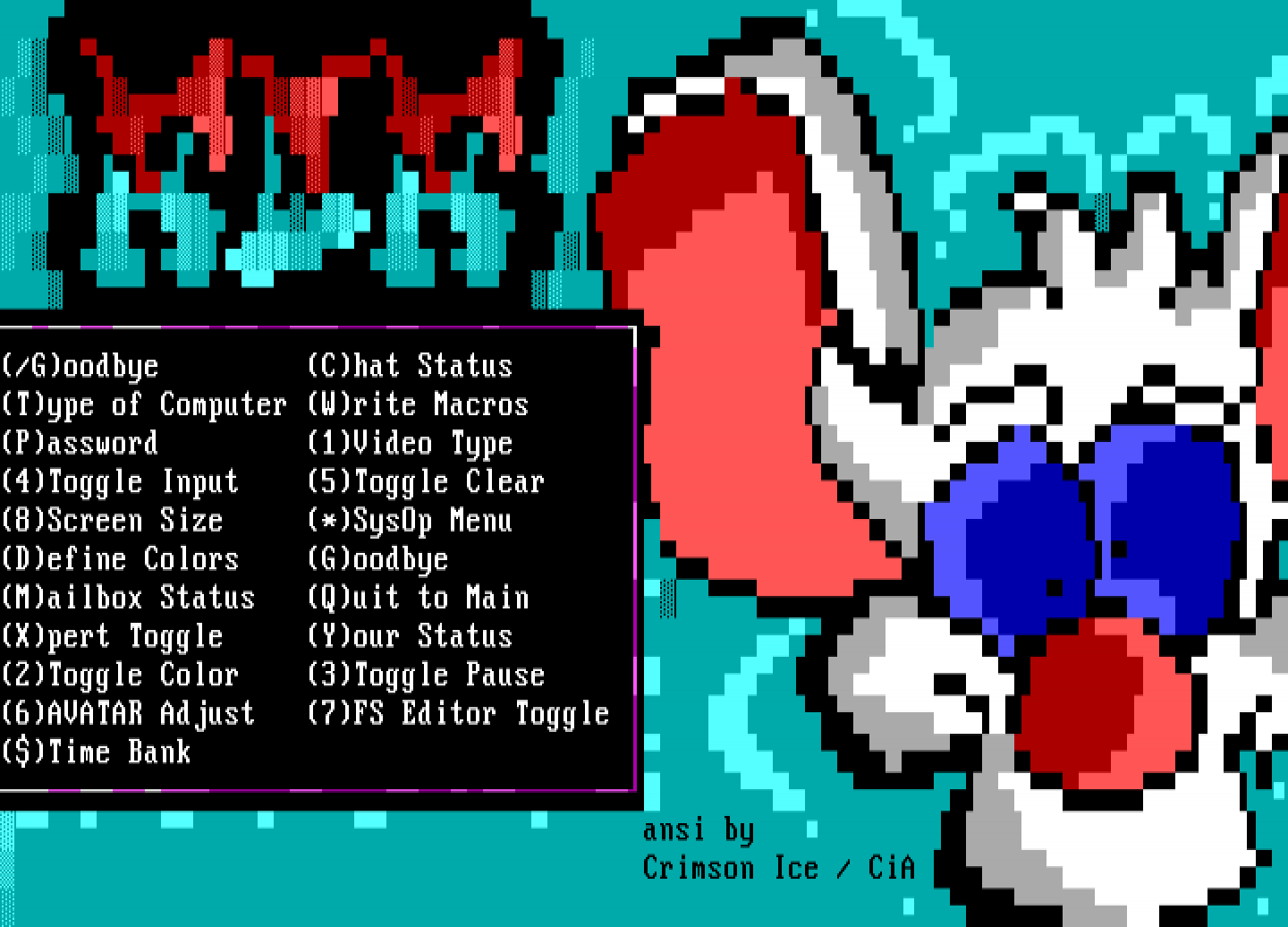 /Goodbye Chat Status Type of Computer Write Macros Password 1Video Type 4Toggle Input 5Toggle Clear 8Screen Size *SysOp Menu Define Colors Goodbye Mailbox Status Quit to Main Xpert Toggle Your Status 2Toggle Color 3Toggle Pause