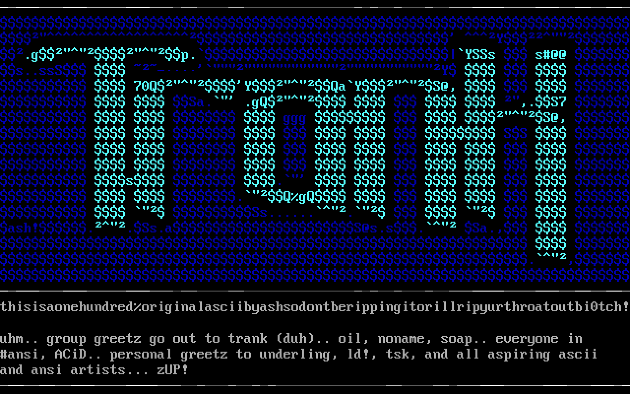 ansi, ACiD.. personal greetz to underling, ld!, tsk, and all aspiring ascii