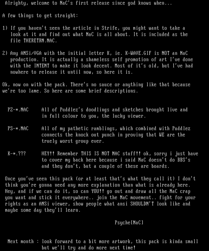 2 Any ANSi/VGA with the initial letter K, ie. K-WAVE.GIF is NOT an NaC