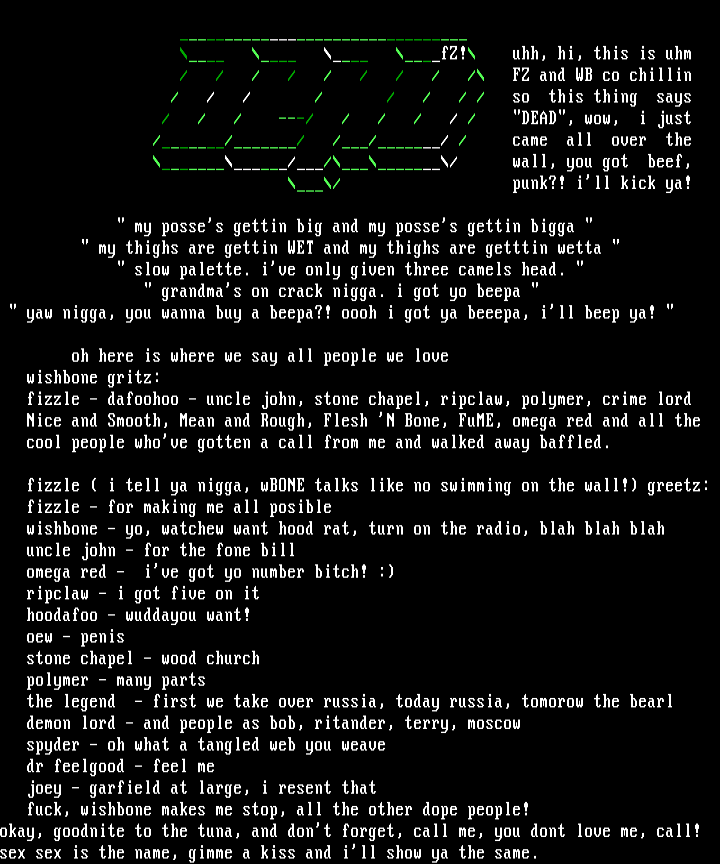 fizzle i tell ya nigga, wBONE talks like no swimming on the wall! greetz:
