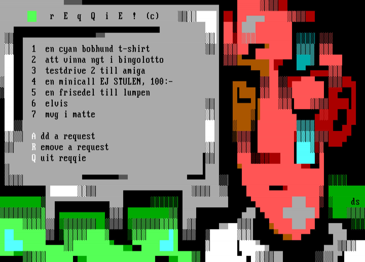 4 en minicall EJ STULEN, 100:- 5 en frisedel till lumpen 6 elvis 7 mvg i matte A dd a request R emove a request Q uit reqqie