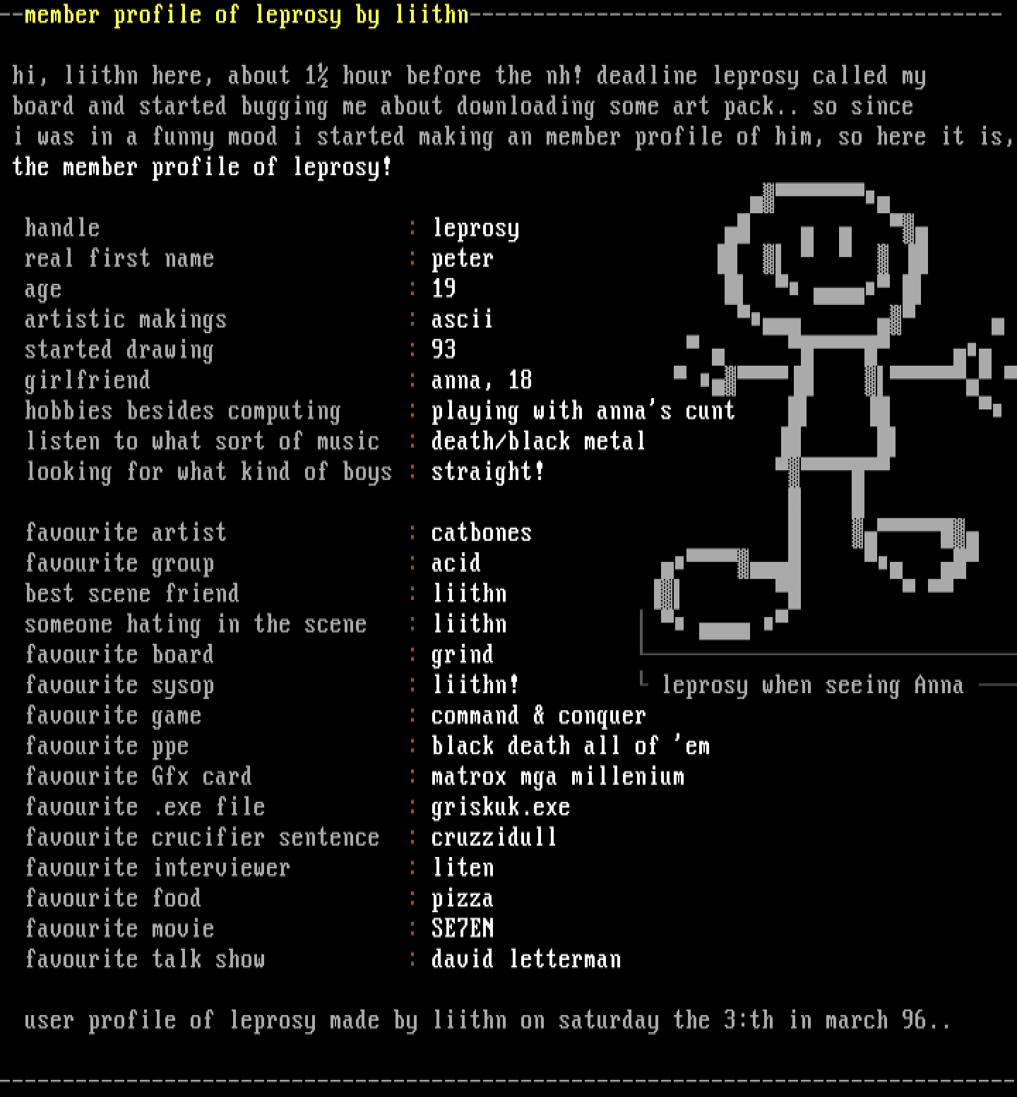 user profile of leprosy made by liithn on saturday the 3:th in march 96..