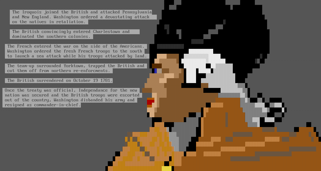 The Iroquois joined the British and attacked Pennsylvania and New England. Washington ordered a devastating attack on the natives in retaliation. The British convincingly entered Charlestown and dominated the southern colonies. The French entered the war on the side of the Americans. Washington ordered the fresh French troops to the south to launch a sea attack while his troops attacked by land. The team-up surrounded Yorktown, trapped the British and cut them off from northern re-enforcments. The British surrendered on October 19 1781. Once the treaty was official, Independance for the new nation was secured and the British troops were escorted out of the country, Washington disbanded his army and resigned as commander-in-chief.