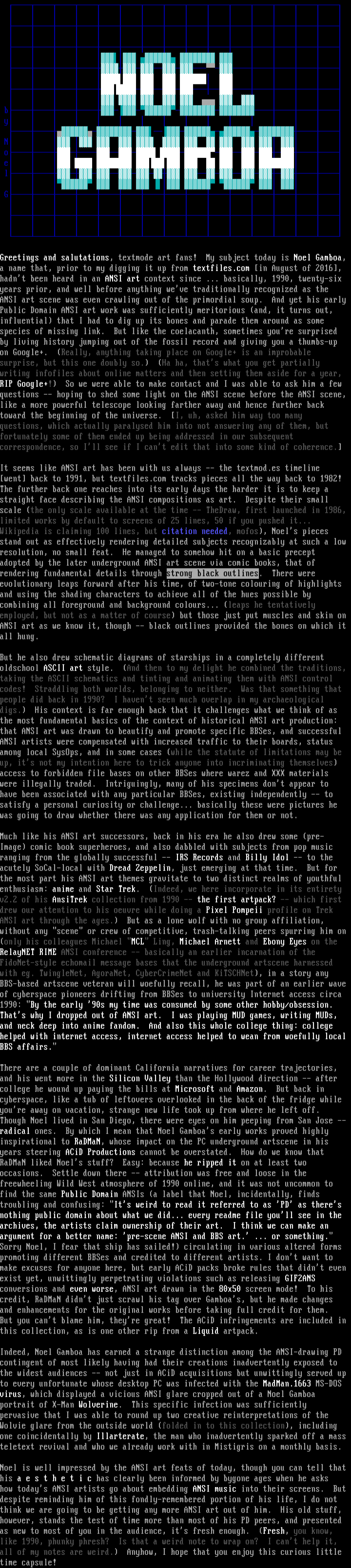 Greetings and salutations, textmode art fans! My subject today is Noel Gamboa,