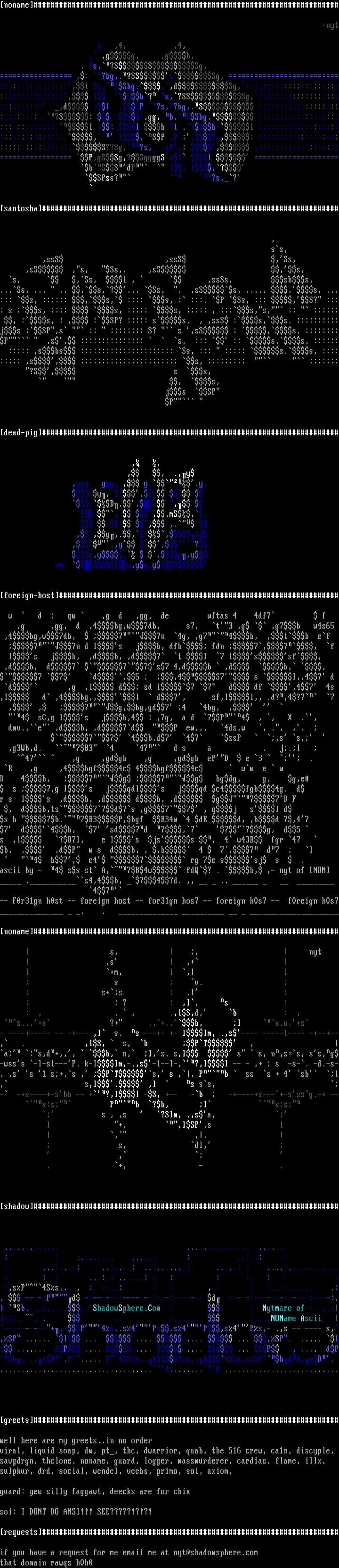 : ...:....: ..:....: ..:.......: .....: : ....:............ : : : ...:.: ......: : : : :. : : : :,sP4Ss,. , : :...: : : , : : :...:...... .:,: ----:Pd -:------:-------:---:------- d -----:-------:-----:----:,.Sb. ..:.......:ShadowSphere.Com : . : Nytmare of :....::::. . . . . .. :...... . :....NOName Ascii ----------+.-P4s..s4Ps.s4P,s4Ps,- .,s ------- s,,SP ...... l ... .... .... ... ,SP. ..... ll ....... .dP .... .... .... ... P , .... .dPb. .,sD.P..... P4S?s,.bS?s,.b4Ss,sSPbdb,sD.