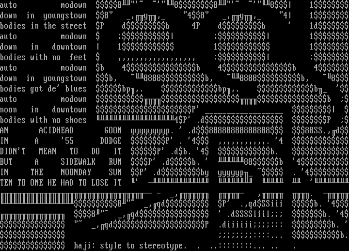 auto modown 8 88 8 1down in youngstown 8 ,y, 48 ,y, 4 1bodies in the street P db 4P db 1dauto modown 1down in downtown 1 1 1bodies with no feet ,,,,,,,,,,,,,,,,,, : :auto modown b 4b 4b 4down in youngstown b, 8888b, 8888b, 8bodies got de blues bp,. bp,. b auto modown b noon in downtown P bodies with no shoes 4P .d P AN ACIDHEAD GOON yyyyyyyyp. .d88888888888888 88SS.,dIN A 55 DODGE P . 4 ,,,,,,,,,,,. 4 DIDNT MEAN TO DO IT P .db. 4 b. BUT A SIDEWALK RUN P .db. 88b 4IN THE NOONDAY SUN P .dby yyyyyp . 4TEN TO ONE HE HAD TO LOSE IT - - , , . 8 ,qd P .,qdSSiii b. 4 8 ,qd .dSSSSiiii b. 4 ,qdP .diiiiii::: b. ::::... b. haji: style to stereotype. . ..::::::::... .. .