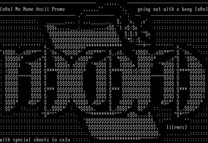 .,,,,. n0n No Name Ascii Promo ,,,,,, , going out with a bang n0n , , ::::::::::::::. ,,,. ,,,, , s, ,s ::::::::::::::::::::::::::::::::::::. s,,,,,,,,,,s,l ss :::::::::::::::::::::::::::::::::::::. , S s :::::::::::::::::::::::::::::::::::::. , S, :::::::::::::::::::: : s s ::::::lS,,sSS Ss,S sSS ,sS, lS,,sSS Ss, :::. S ,s s s ,s s S ,s s :: l ls s la l ls