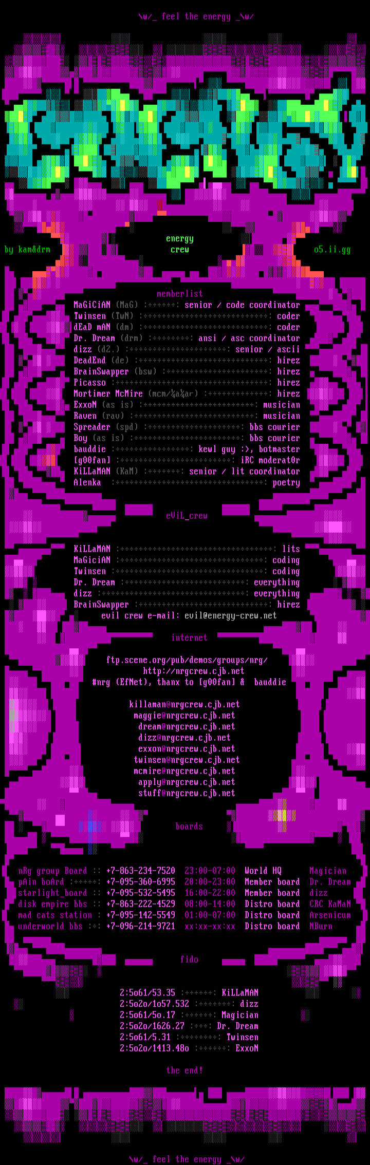 dizz d2. :: senior / ascii DeadEnd de :: hirez BrainSwapper bsw :: hirez Picasso :: hirez Mortimer McMire mcm/aa :: hirez ExxoN as is :: musician Raven rav :: musician Spreader spd :: bbs courier Boy as is :: bbs courier bauddie :: kewl guy :, botmaster g00fan :: iRC moderat0r KiLLaMAN KaM :: senior / lit coordinator Alenka :: poetry