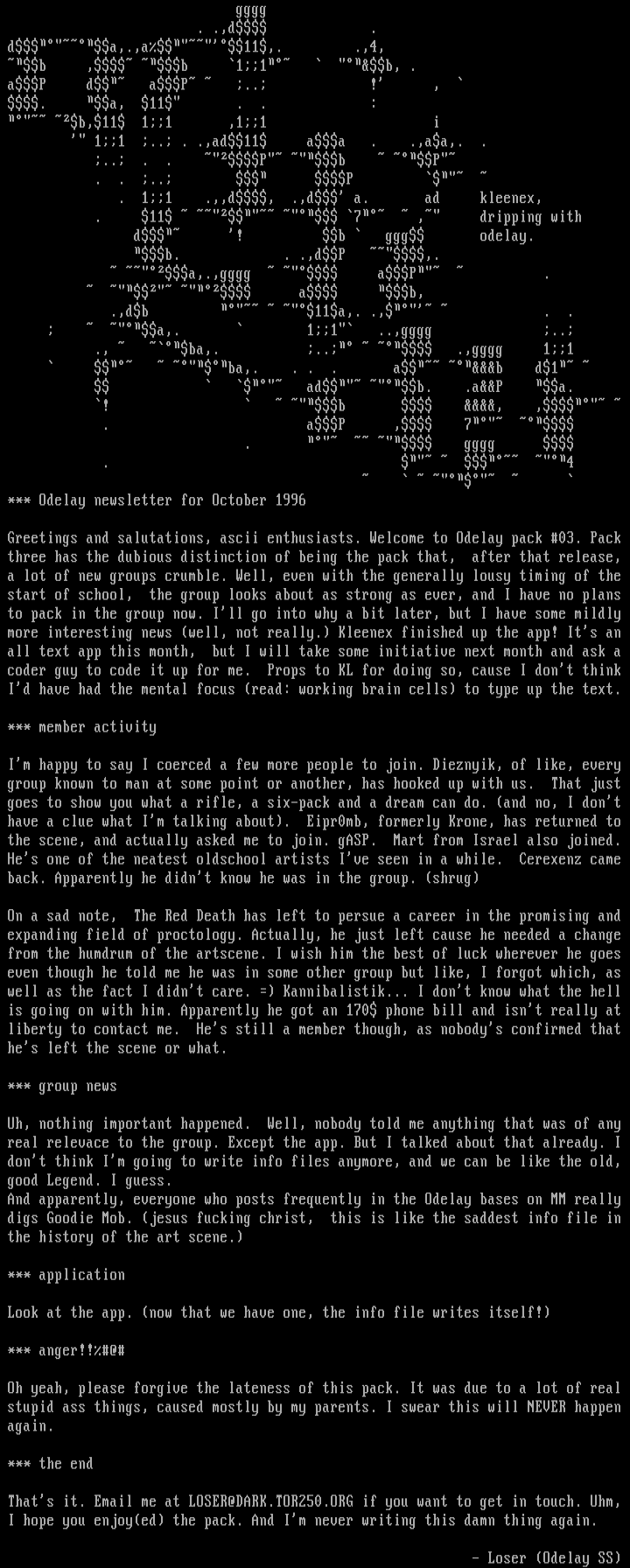 Greetings and salutations, ascii enthusiasts. Welcome to Odelay pack 03. Pack