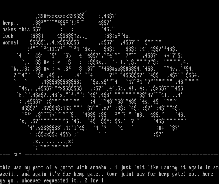 this was my part of a joint with amoeba.. i just felt like usuing it again in anascii.. and again its for hemp gate.. our joint was for hemp gate so.. here
