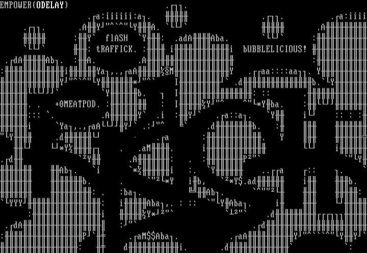 .a:iiiiii:a. .. .a:iiii .. .AYYA. .A :Y flASH Y: .adAAba. : : tRAFFICK. : ii bUBBLELICIOUS! .dAAb. :A. .A ::iYa,.,aAMY .aa::::aa. YYY* I .db.Y Yb. I: :: .. . +0MEATPOD. : : IY *Yba. :::: . .AY .i :Y .a::a. Y i :: : :i Ya,.,aAY .: .db. : Y .d .a :. Y *Y . .aM. i i.d Y .A: . :P Y Ab. i *i :. Y ..a :: . b. . *Y ib, *Y.ad i b. : . :ba. Ab. : YYY: iAba,. : :: YAba. i :i Y* .d .dA : .d:P .aMAba. .aAYYY: di. .d :